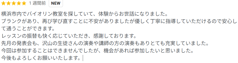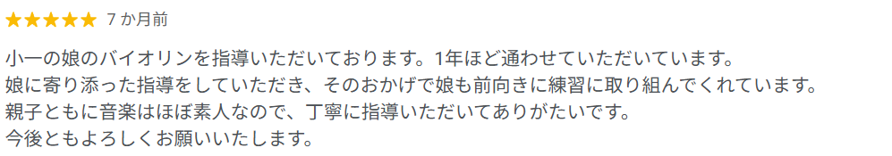 当音楽教室にお通いいただいている生徒の皆様の声をご紹介します。▶Googleレビューより ▶第1回音楽発表会後のアンケートより(2024年9月) 当音楽教室にお通いいただいている生徒の皆様の声をご紹介します。 ▶Googleレビューより ▶第1回音楽発表会後のアンケートより(2024年9月) ヴァイオリンクラス・小学生ご兄弟 保護者の方 ヴァイオリンクラス・小学生ご姉妹 保護者の方 ヴァイオリンクラス・大人の方 ピアノ・ヴァイオリンクラス 小学生・未就学 ご姉弟 保護者の方 ピアノクラス・小学生お子さま 保護者の方 ピアノクラス・大人の方 フルートクラス・大人の方 ヴァイオリンクラス・小学生お子さま 保護者の方 ヴァイオリンクラス・中学生お子さま 随時、更新していきます。 体験レッスン(無料)について 随時、更新していきます。 体験レッスン(無料)について